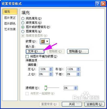 先来设计背景:右击幻灯片空白处→设置背景格式,单击 “填充”,依次通过填充效果→图片或纹理填充→插入自“文件”,找到预先准备好的背景图片插入。(创作模板之前,制作好要用到的背景图片、背景图片中可在网上下载,也可用Photoshop等软件自己打造。)