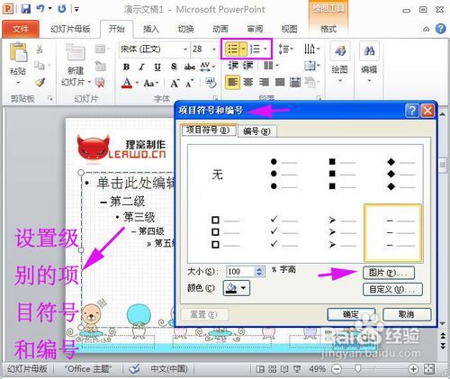设定幻灯片字体:选定母版标题文字,设置字体、字号、颜色(图4);依次选定母版各级文本文字,设置字体、字号、颜色,通过“段落→项目符号和编号→项目符号项→图片”选择自己满意的图片作为这一级的项目符号项标志(图5)。 (图4) (图5)