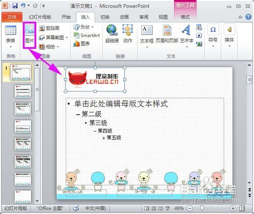 图片的插入:在适当的地方用“插入→图片→来自文件”的方法插入小图片或gif动画文件。幻灯片模板设计打造图片时,图片的色调最好是淡雅些,可以加上个性化的图形文字标志,为了让设计模板小一些,图片的格式最好用.jpg格式。
