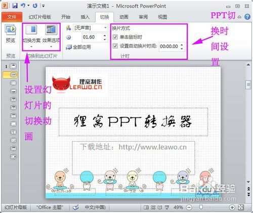 模板中幻灯片切换与PPT切换时间设置:通过“切换→切换方案”设置该幻灯片的切换动画,然后通过“换片方式”→“设置自动换片时间”,如果让所有的幻灯片都用一样的幻灯片切换动画与切换时间,设置后鼠标点击“全部应用”即可: