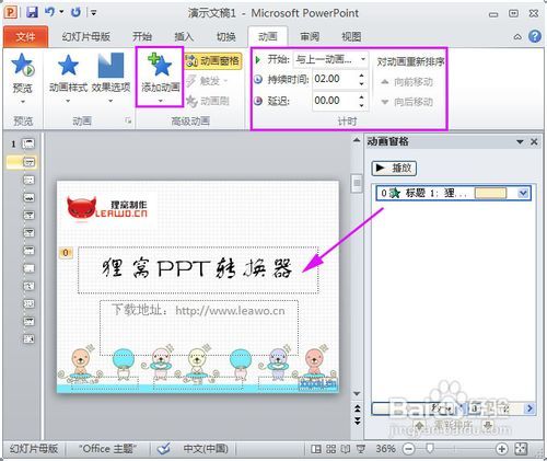 动画设置:分别选定各级对象,通过“动画→添加动画”设置该对对象的动画方式,再通过“动画窗格”跟“计时”设置所有对象的出场顺序,对不满意的地方也可以进行修改。