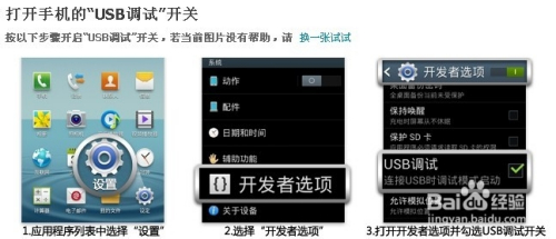 启动三星手机USB调试。打开应用程序中的《设置》——《开发者选项》——《USB调试》...