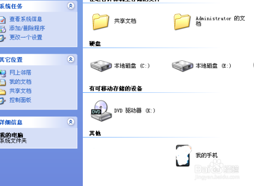 最原始连接方式——手机和电脑里都没有安装百度手机助手等软件。数据线连接手机和电脑的USB口后,自动搜索匹配基本驱动,我的电脑中会多出一个驱动器盘符,这时候,我们的手机接入方式,就类似U盘,或者前几年流行的MP3播放器。可以进行手机与电脑之间的数据交换,但是沟雁塑非常麻烦。