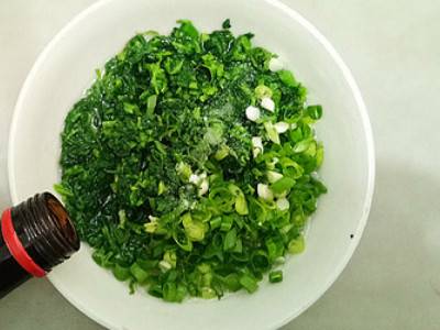 清洗干净的荠菜焯水,焯过水的荠菜过凉,切末,香葱切末。