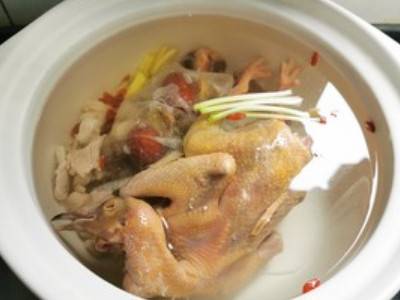 将鸽子放进砂锅里,加老酒、姜片、葱段、枸杞、清水,盖上锅盖大火煮开。