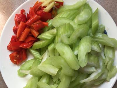 芹菜掐掉老筋,斜切厚片,红椒切块,生姜切丝。