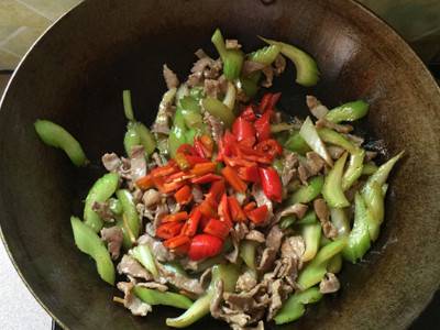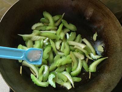 锅中留底油,下姜丝和芹菜。翻炒制芹菜略变色的时候加精盐。
