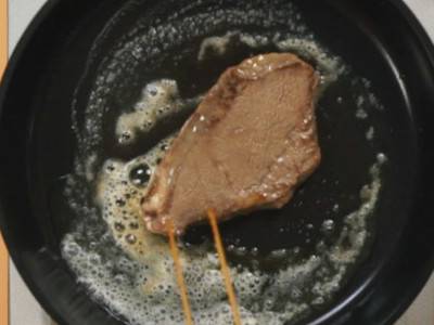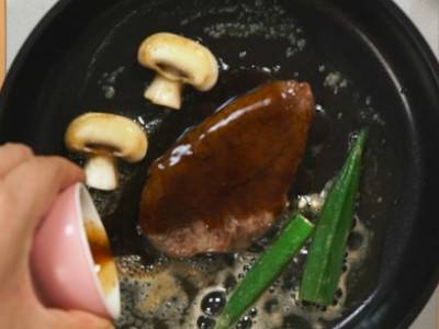 大火煎两面各90秒,倒入少许的黑椒橘子汁即可出锅食用。