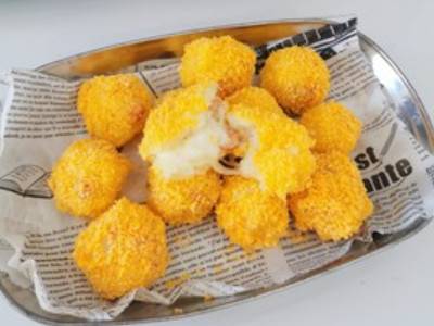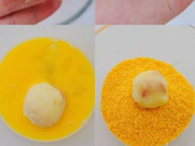 包住芝士碎,滚圆裹上蛋液、面包糠。