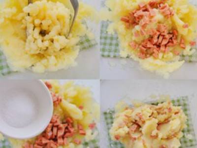 土豆去皮切片,火腿切丁,土豆压成泥,放入火腿丁、盐搅拌均匀。