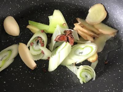 热锅烧油,放入葱、姜、蒜、花椒、八角爆香,炒至葱段变金黄色。