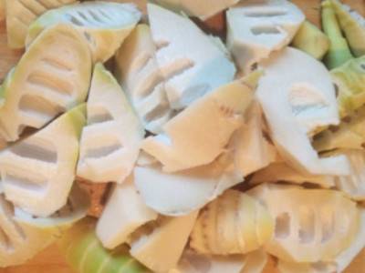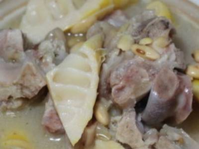 将黄豆浸泡过夜,将笋去皮连刀切块,猪脚洗净。