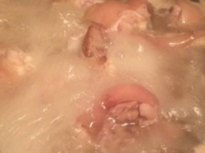 猪脚放进锅里煮沸,捞去浮沫,加入适量的料酒,煲十分钟。