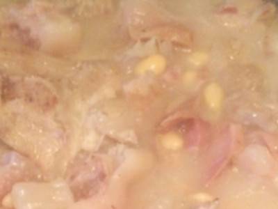 然后加入黄豆用中火煲半个小时,煲的过程中翻动一下,以免粘锅。