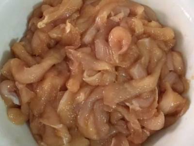 里脊肉洗净切成条,放入盐、料酒、生抽、白胡椒腌制5分钟。