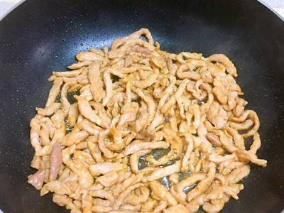 肉丝倒入锅中炒熟。